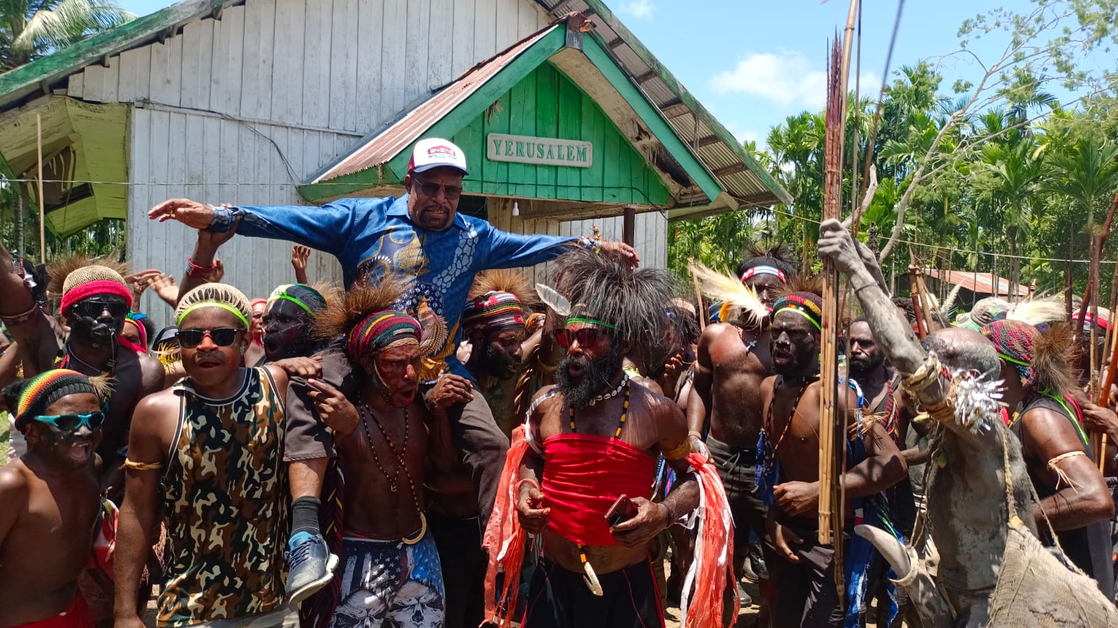 Yunus Wonda yang juga Wakil Ketua I DPR Papua ini, begitu tiba di Kampung Lapua, Lereh, langsung disambut dan diarak Jemaat GIDI Jerusalem menuju tempat acara.