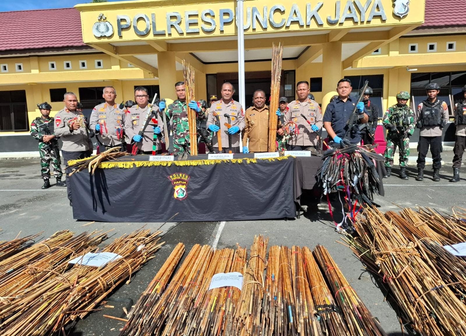 Selain itu, Kapolda Alfred Papare mengungkapkan razia alat perang yang berhasil disita dari masyarakat kedua kubu paslon bupati, diantaranya 8.789 anak panah, 460 tali busur panah, 497 busur panah,18 kapak, 2 pucuk senapan angin, 2.500 katapel, 1 katapel rakitan, 1 unit HT, 10 atribut kepala perang, 6 buah meriam kaleng dan 512 parang.