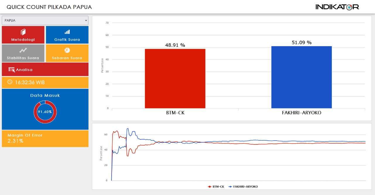 “Berdasarkan, data 91,6 persen data yang masuk tersebut, quick count menunjukkan pasangan Matius Fakhiri – Aryoko Ferdinand Rumaropen unggul dengan perolehan 51.09%, sementara pasangan Benhur Tomi Mano – Constant Karma perolehannya 48.91%,” ungkapnya.