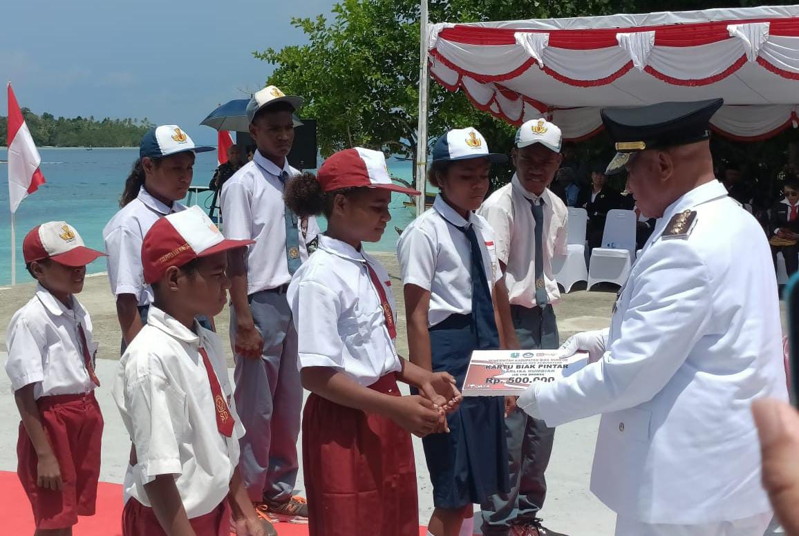 Secara simbolis penyerahan Kartu Biak Pintar dilakukan Bupati Biak Numfor Markus Octovianus Mansnembra, SH, MM kepada empat perwakilan siswa/i yang sekolah diwilayah Kepualauan Paidaido – Aimando, setelah peringatan detik-detik Proklamasi Kemerdekaan Republik Indonesia ke 80, di Dermaga Pulau Bromsi, Distrik Aimando, Minggu, 17 Agustus 2025