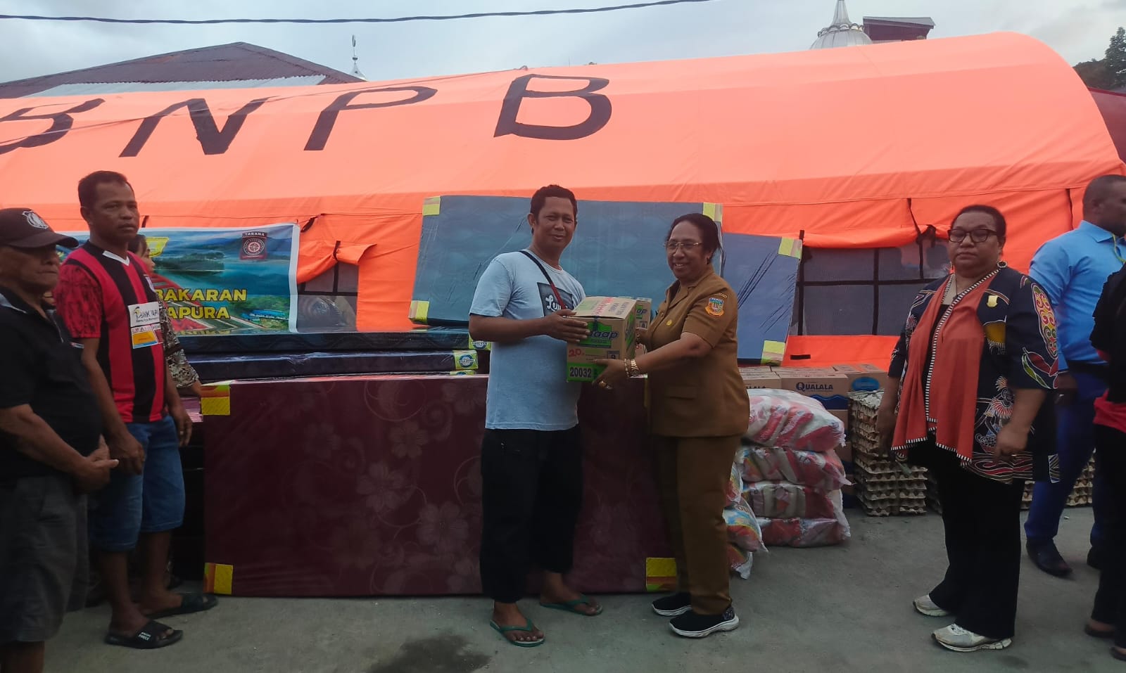 Adapun bantuan yang diserahkan antara lain 150 karung beras, 30 karton mie instan, 30 karton air mineral, telur ayam, serta 30 buah kasur.