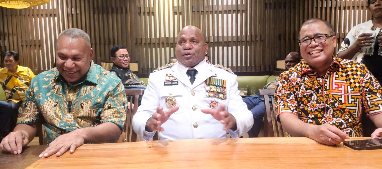 Chaotion Foto: Gubernur Papua, Komjen Pol (Purn) Matius D Fakhiri didampingi Wakil Gubernur Papua, Aryoko Alberto Ferdinand Rumaropen dan Juru Bicara Mari-Yo, M Rifai Darus di Restoran Amanaia, Jakarta, Selasa (8/10/2025).
