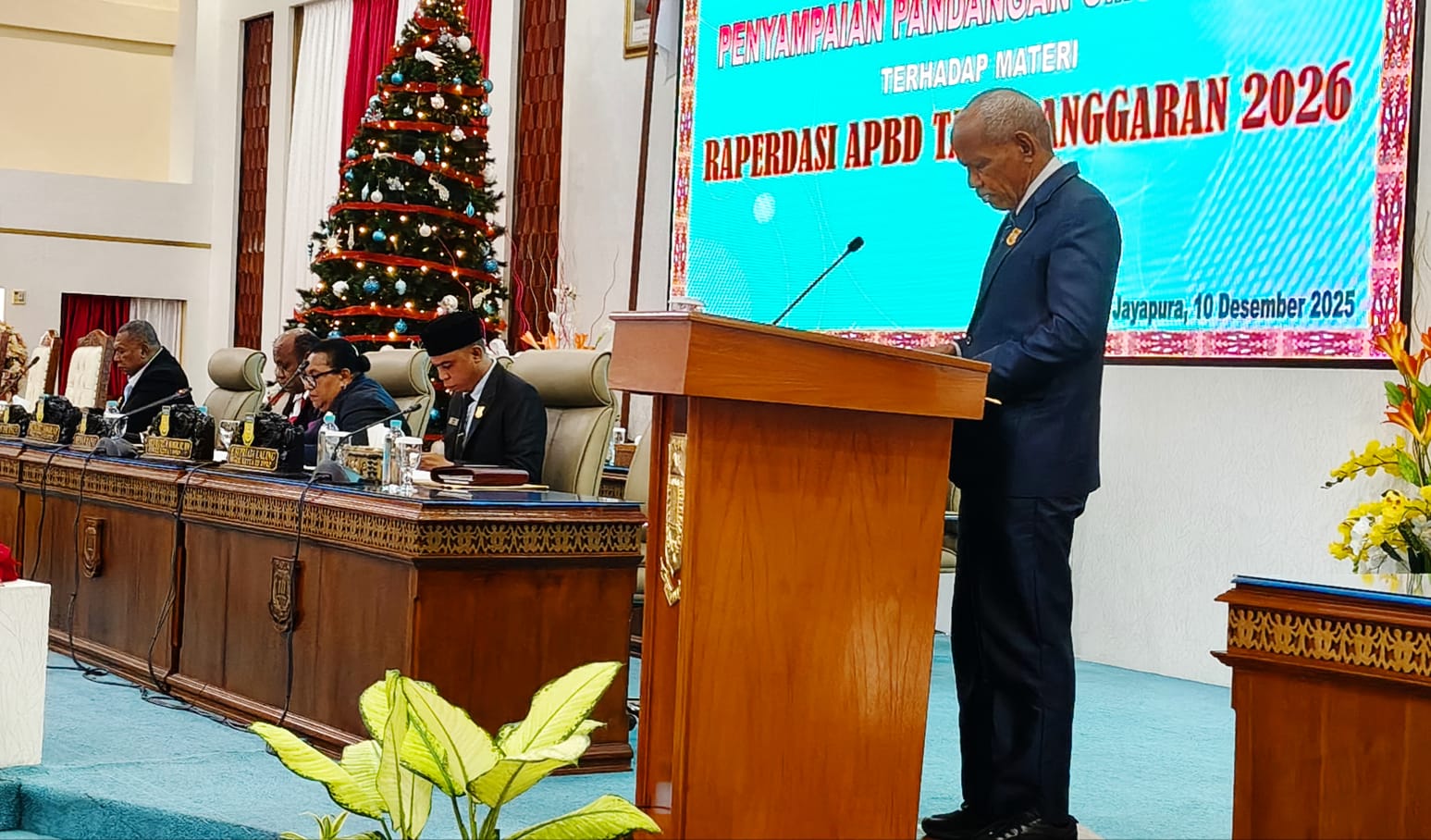 Wakil Ketua Fraksi NasDem DPR Papua Alberth Meraudje, ST, MT menyampaikan pandangan umum fraksinya dalam rapat paripurna membahas RAPBD 2026.