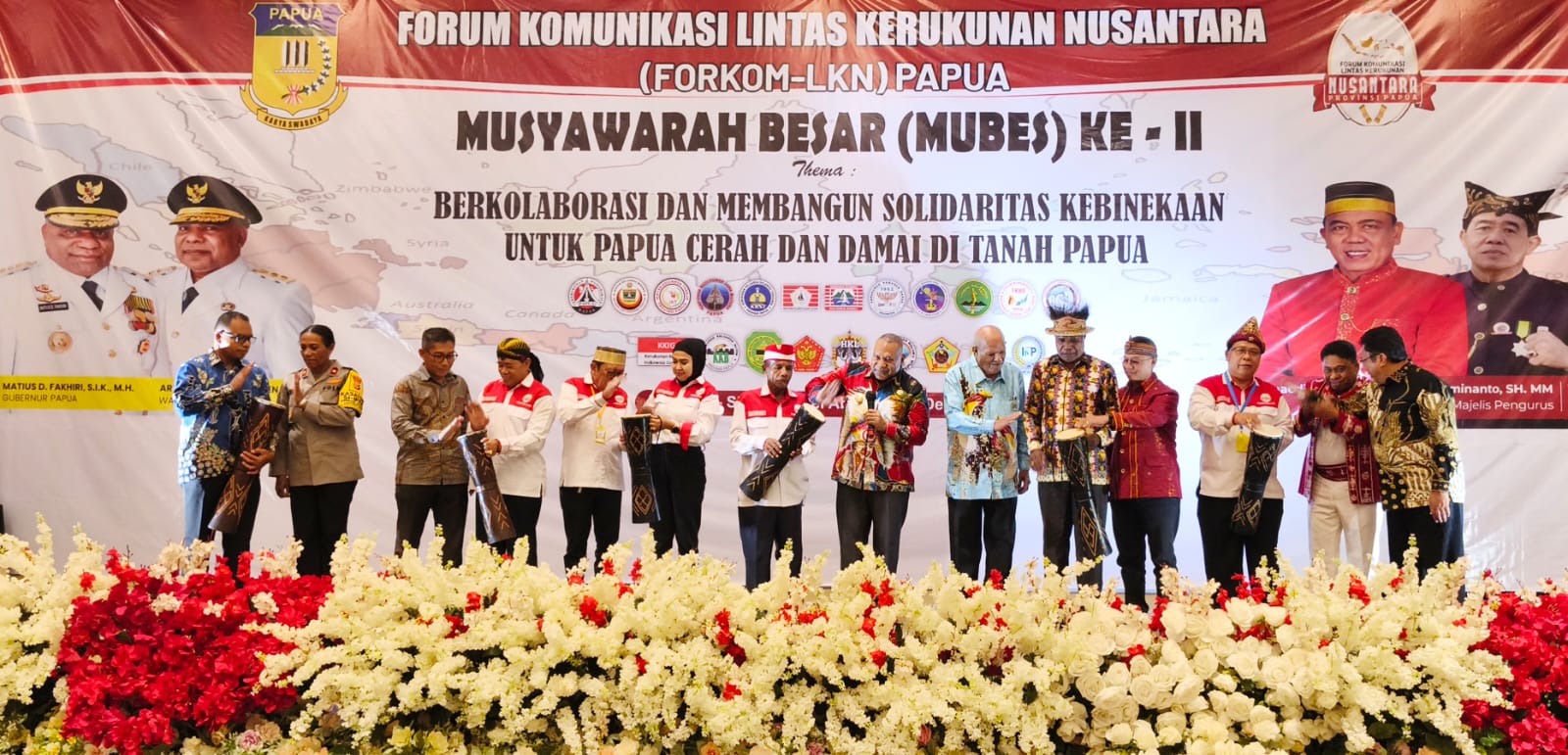 Mubes II Forkom LKN Papua mengusung tema “Berkolaborasi dan Membangun Solidaritas Kebinekaan untuk Papua Cerah dan Damai di Tanah Papua”. Kegiatan ini dibuka oleh Gubernur Papua Matius D Fakhiri yang diwakili Wakil Gubernur Papua Aryoko Rumaropen.