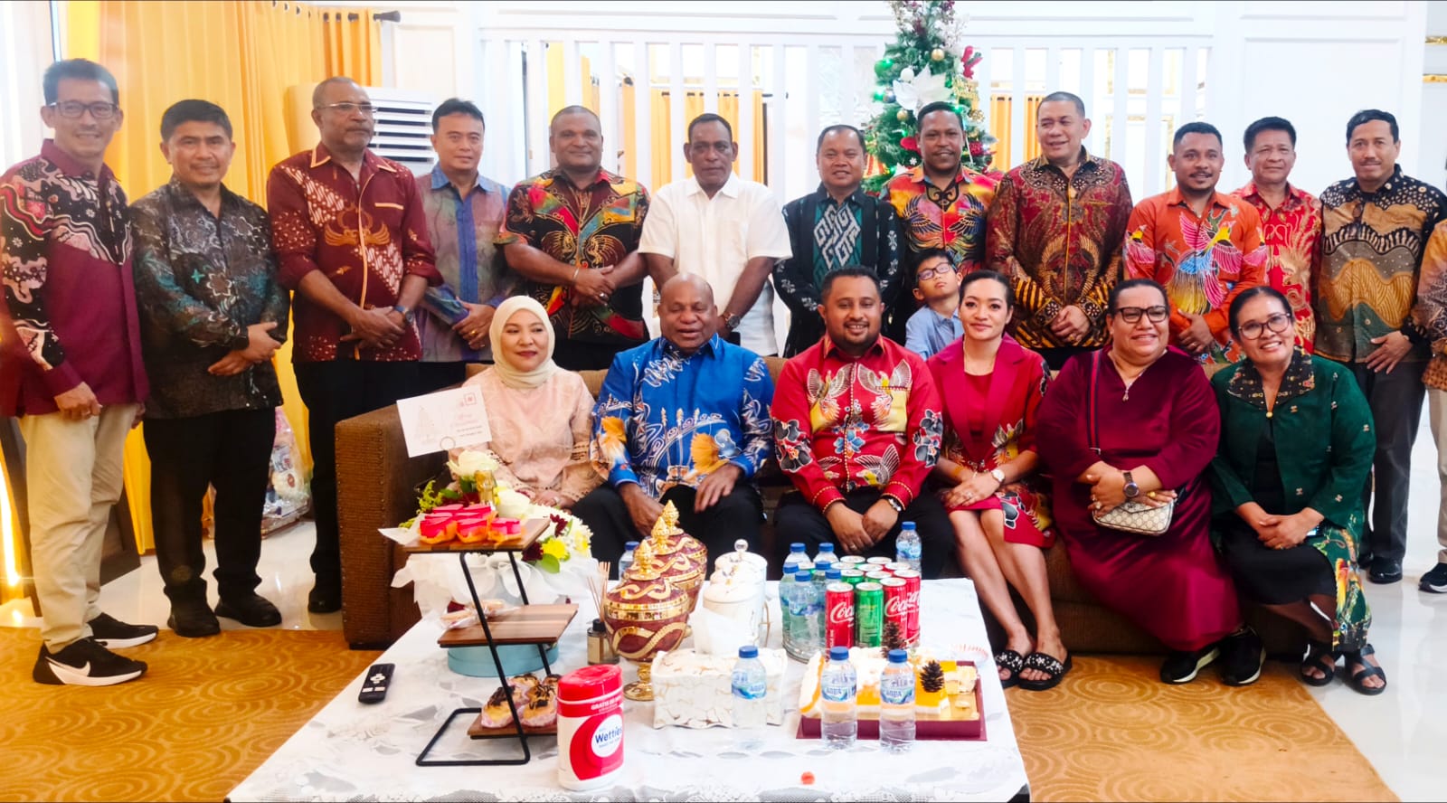 Gubernur Papua Komjen Pol (Purn) Matius D Fakhiri bersama istri Ny Eva Fakhiri foto bersama Ketua DPR Papua, Denny Henrry Bonai berasma Wakil Ketua I DPR Papua, Herlin Beatrix M Monim dan anggota DPR Papua serta kepala OPD saat silaturahmi ke Ketua DPR Papua, Kamis, 25 Desember 2025.