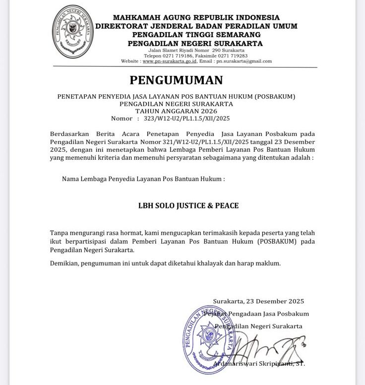 Seleksi Pengadaan Layanan Posbakum tersebut dilaksanakan oleh Pengadilan Negeri Surakarta pada Desember 2025. LBH Solo Justice & Peace menjadi salah satu peserta dan berhasil lolos setelah melalui tahapan seleksi yang ketat. Penetapan pemenang diumumkan secara resmi pada 23 Desember 2025 melalui akun media sosial Instagram Pengadilan Negeri Surakarta.
