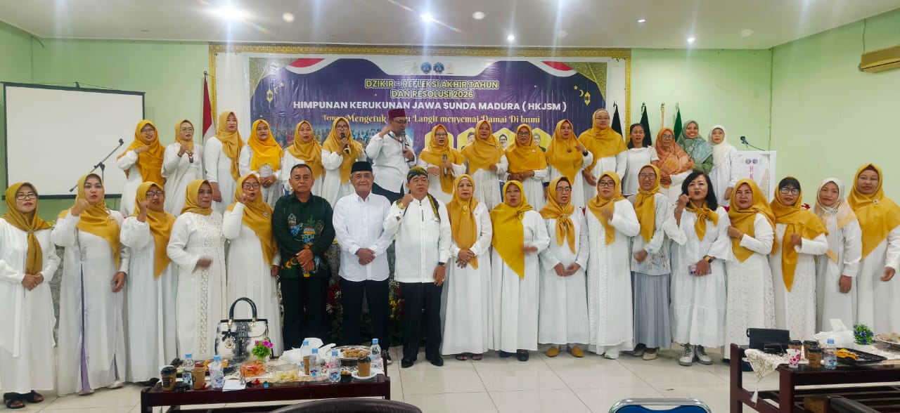 JAYAPURA, Papuaterkini.com – Dewan Pimpinan Pusat (DPP) Himpunan Keluarga Jawa Sunda Madura (HKJSM) di Tanah Papua bersama Dewan Pimpinan Wilayah (DPW) HKJSM Papua, Srikandi, dan Pemuda HKJSM menggelar Dzikir bersama, Refleksi Akhir Tahun 2025 serta Resolusi Tahun 2026. Kegiatan ini berlangsung di Aula Asrama Haji Kotaraja, Abepura, Kota Jayapura, Minggu (28/12/2025).