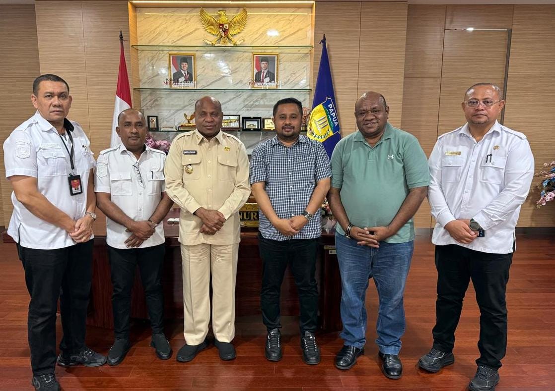 Ketua DPR Papua, Denny Henrry Bonai, ST, MM, MH dan Wakil Ketua II DPR Papua, Mukry M Hamadi foto bersama dengan Gubernur Papua, Matius D Fakhiri didampingi Kepala BPKAD M Rusdianto Abu dan Kepala Bapperida Muflih Musaad dan Kepala Inspektorat, Danny Korwa membahas kecelakaan laut di Yapen, Rabu, 31 Desember 2025.