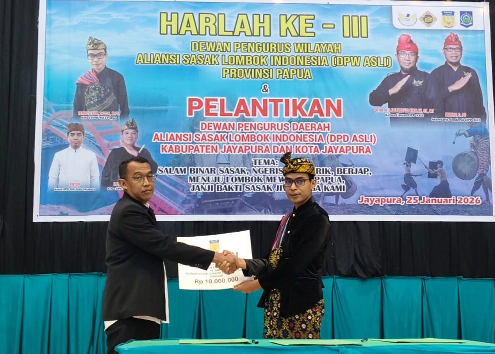 JAYAPURA, Papuaterkini.com – Kepengurusan Dewan Pimpinan Daerah (DPD) Aliansi Sasak Lombok Indonesia (ASLI) Kota dan Kabupaten Jayapura periode 2026–2031 resmi dilantik oleh Ketua DPW ASLI Papua, H. Tarmizi Tahir, di Aula LPTQ Provinsi Papua, Kotaraja, Abepura, Minggu (25/1/2026).