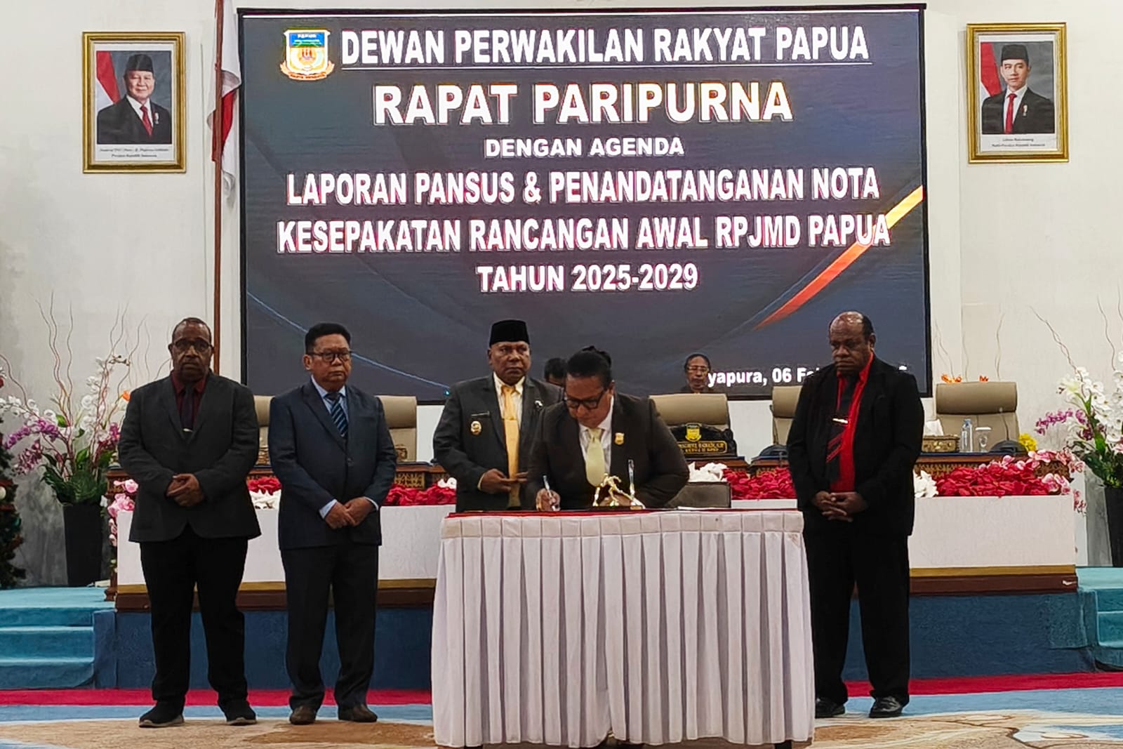 Kesepakatan tersebut dituangkan dalam Nota Kesepakatan Ranwal RPJMD yang ditandatangani Wakil Ketua I DPR Papua Herlin Beatrix M Monim, Wakil Ketua II DPR Papua Mukri M Hamadi, serta Wakil Gubernur Papua Aryoko AF Rumaropen mewakili Gubernur Papua Matius D Fakhiri.