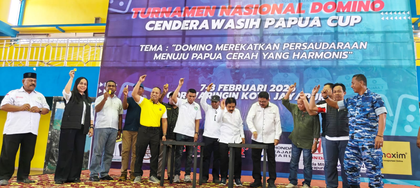Pembukaan Turnamen Nasional Domino Cenderawasih Papua Cup ditandai dengan pemukulan kartu domino ke meja oleh Gubernur Papua diwakili Plt Kadis Pendidikan Papua Laurenz Wantik didampingi Ketua Umum PORDI Dr H Andi Jamaro Dulung, MSi, Sekjen PORDI Prof Dr H Mansyur Achmad, MSi , Ketua Umum Pengprov PORDI Papua, H Supriadi Laling, SAP bersama Forkompinda Papua dan Kota Jayapura di GOR Waringin Kotaraja,Sabtu, 7 Februari 2026.
