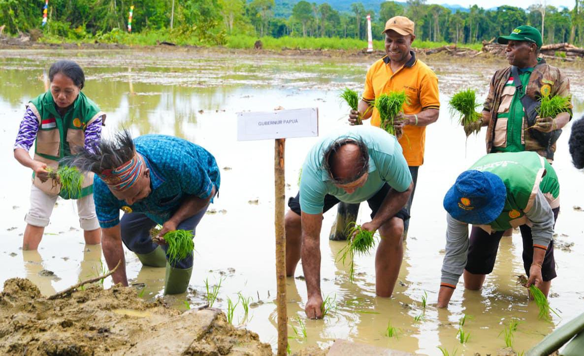 JAYAPURA, Papuaterkini.com – Gubernur Papua Matius D. Fakhiri bersama Bupati Jayapura Yunus Wonda melakukan penanaman padi perdana sekaligus menyerahkan 43 unit alat dan mesin pertanian (Alsintan) di Kampung Swentab, Distrik Kemtuk Gresi, Kabupaten Jayapura, Sabtu (28/3/2026).