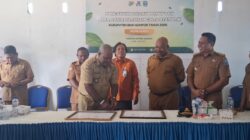 Selain itu, dilakukan pula penandatanganan berita acara penyerahan naskah TMMD oleh Plt. Sekda Zacharias L. Mailoa yang mewakili Bupati Biak Numfor bersama Dandim 1708/BN Letkol Kav Alberth Suweny, S.H serta Kabid Ekonomi DPMK Biak Numfor, Selviana J. Wompere, S.Sos.