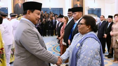 Chaption: Presiden Prabowo Subianto memberi selamat kepada Wamendagri Ribka Haluk usai dilantik jadi anggota KEPP…